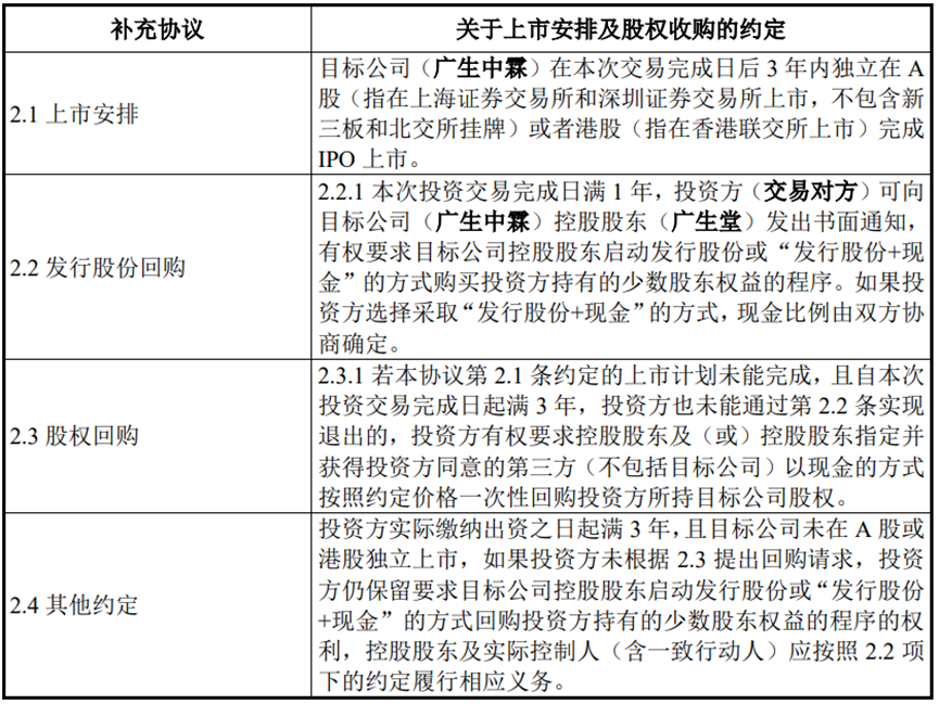 根据交易对方入股广生中霖的增资协议及补充协议,虽然增资协议中约定了回购条款,但该类条款仅是以上市安排计划作为触发条件的。回购条款与其他补偿机制一样,上述条款是投资者自身利益被动保护的一种手段,而非交易对方的追求目标。回购条款的设置并不影响交易目的和投资模式,仅是对投资者的保护措施,是股权投资领域的常见条款。
