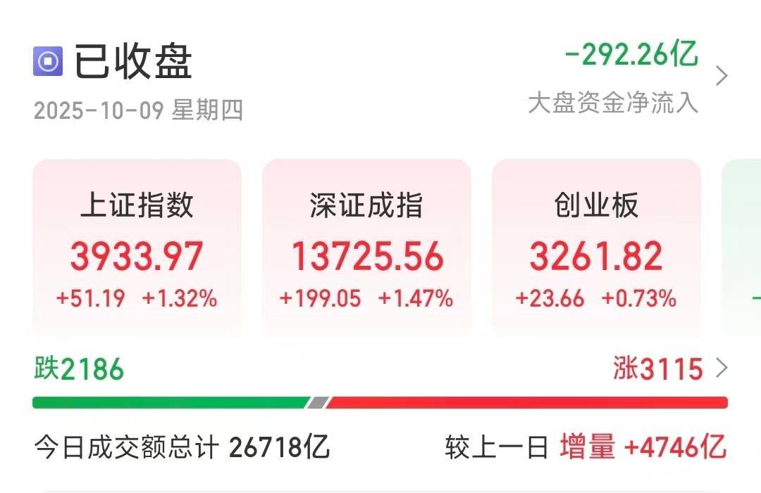 【大河财立方消息】10月9日旗开网,国庆中秋假期节后第一天,A股市场迎来开门红。截至收盘,沪指涨1.32%,站上3900点,创十年来新高;深证成指涨1.47%,创业板指涨0.73%。