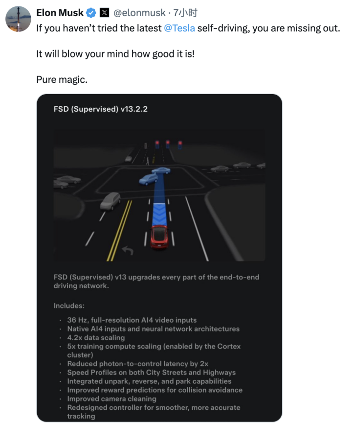 同日股神配资,马斯克本人也在社交媒体上表示:“如果你还没有尝试过最新的自动驾驶,那你就错过了。新版本很棒,一定会让你惊叹不已!——纯粹的魔法。”