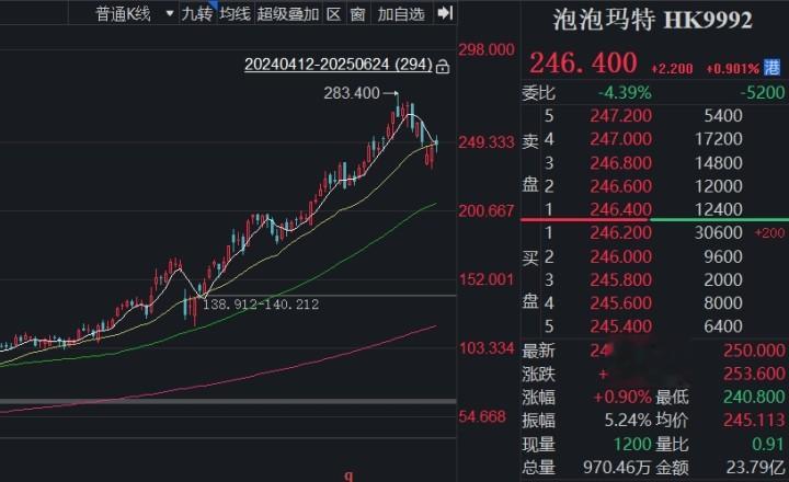 在玩偶抢购潮中,泡泡玛特港股股价在2025年6月12日最高触及283.4港元/股,较年初大涨218.74%,这还是在2024年该股大涨366%的基础上实现的。泡泡玛特成为当下“新消费”的代名词,港股泡泡玛特堪称年轻人的“塑料茅”。