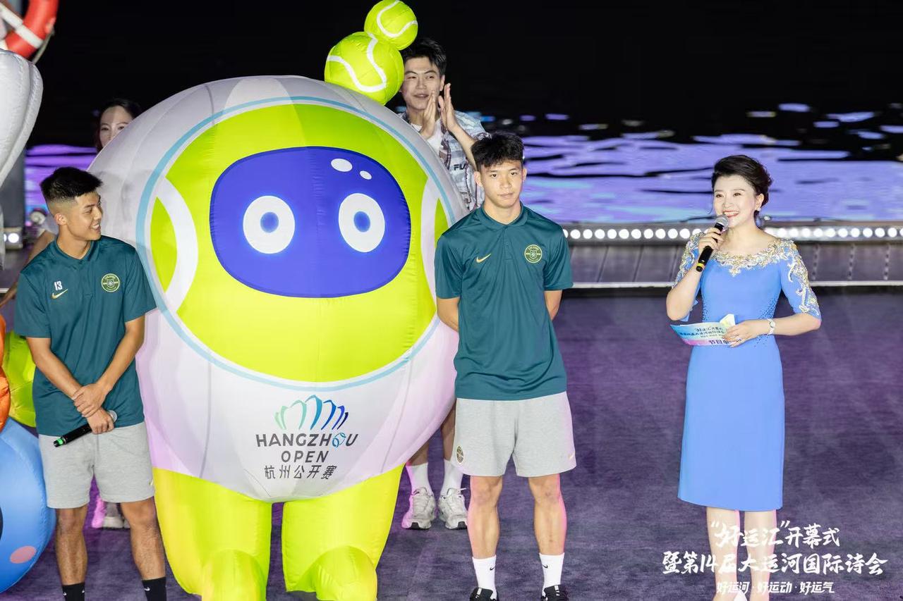 现场迎来两组神秘嘉宾点燃气氛:浙江职业足球俱乐部的刘浩帆、汪士钦、麻皓齐和王钰栋踏着动感节拍,献上运动时装秀《好运动起来》。另一组则是萌趣可爱的赛会吉祥物天团——世羽赛总决赛“杭小羽”、浙江职业足球俱乐部“GOGOAL”、杭州赛会AI助手“赛小宝”,以及首次亮相的杭州网球公开赛吉祥物“杭拍拍”。