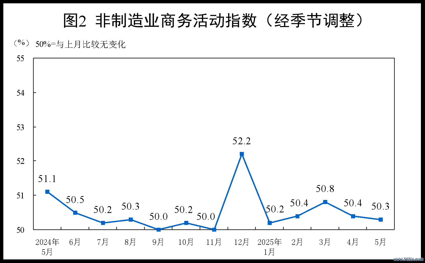 5月份,非制造业商务活动指数为50.3%,比上月略降0.1个百分点,仍高于临界点,非制造业总体延续扩张态势。