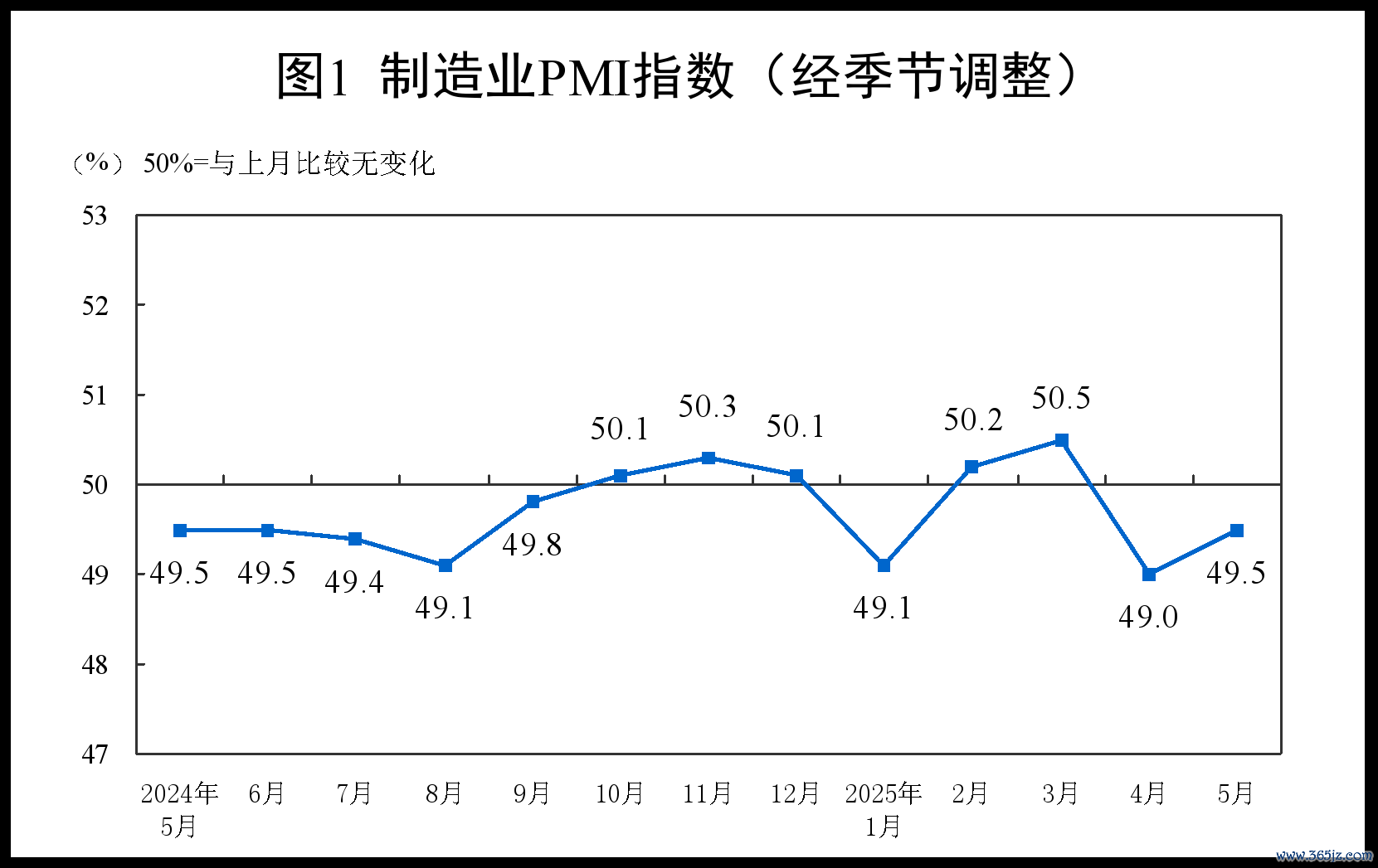 5月31日,国家统计局服务业调查中心和中国物流与采购联合会发布了中国采购经理指数。数据显示,2025年5月鼎合网配资,中国制造业采购经理指数(PMI)为49.5%,较前值回升0.5个百分点,仍在景气线下;非制造业商务活动指数50.3%,较前值回落0.1个百分点,仍在景气线上。综合PMI产出指数为50.4%,比上月上升0.2个百分点,我国经济总体产出保持扩张。